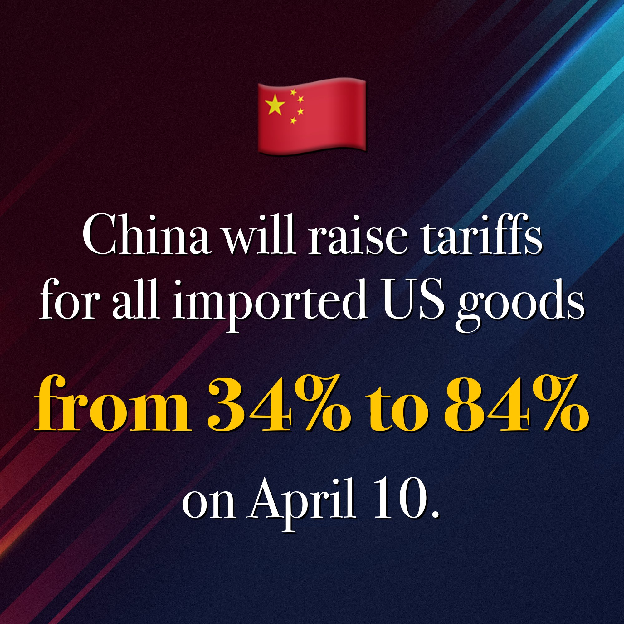 China has raised tariffs for all imported goods from USA from 34% to 84%