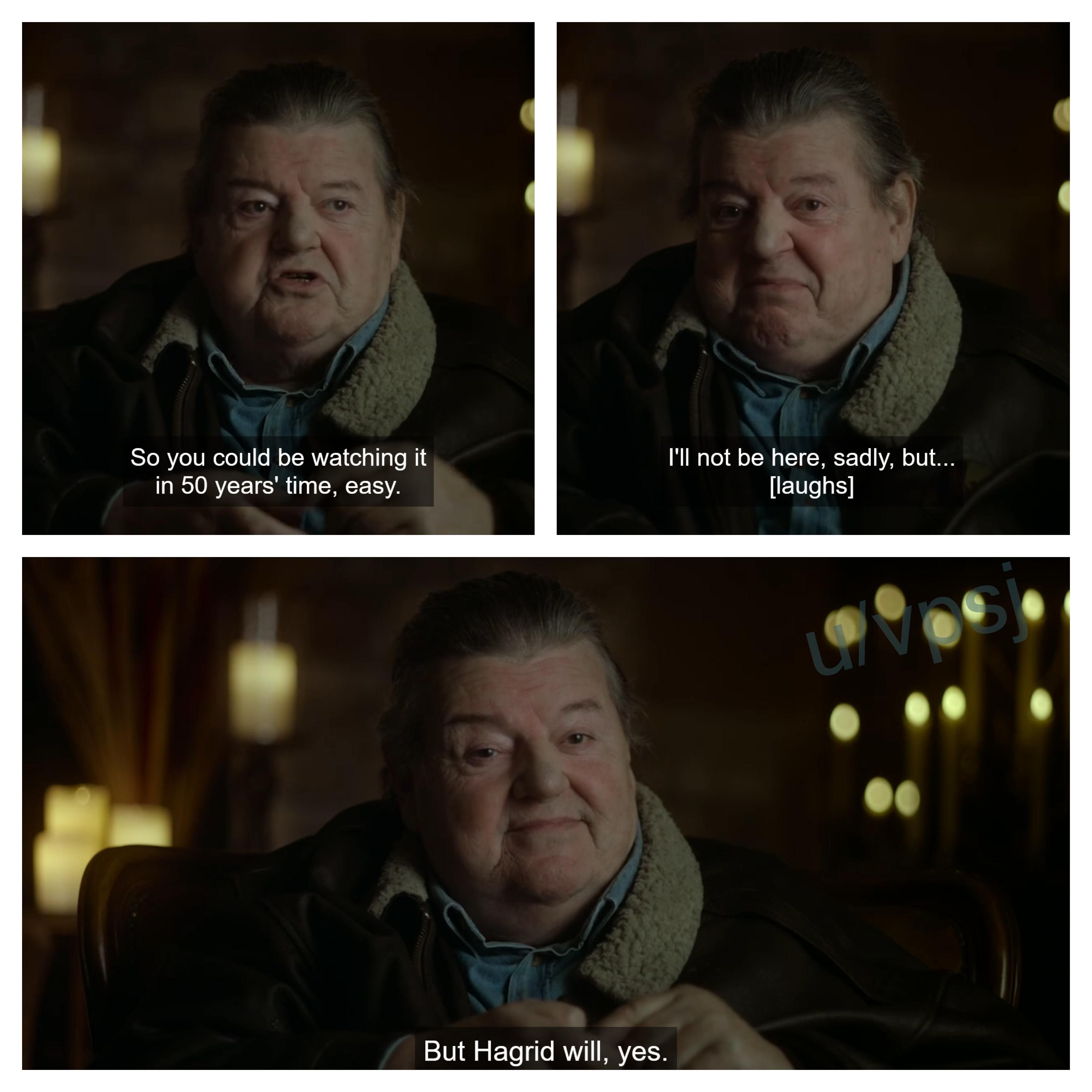 >that one scene where the actor who played hagrid said he might not be around but hagrid will live on…