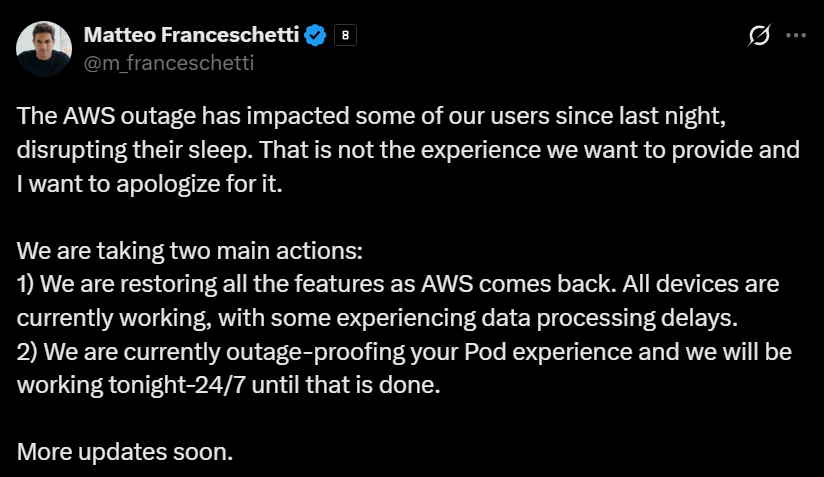 >few months into the usage, the 'smart' bed you bought from 'revolutionary' 'bed' company can't work because of AWS outage