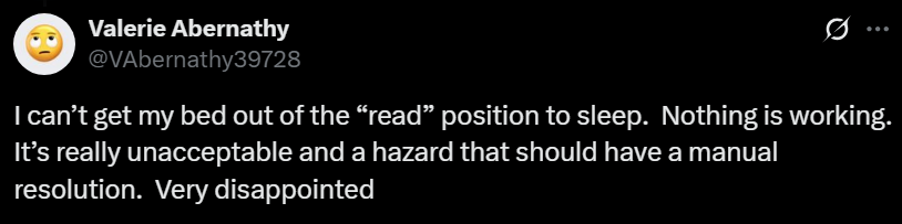 >I can’t get my bed out of the “read” position to sleep. Nothing is working. It’s really unacceptable and a hazard that should have a manual resolution. Very disappointed