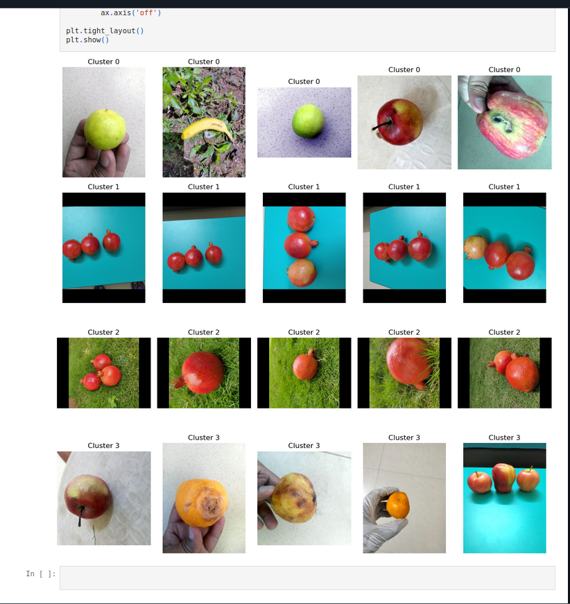 then i did feature extraction and did k means clustering and there were 4 clusters i made, now thing is, in this sample images in picrel it shows fruits in cluster 1 and 2 which is mid ripe and ripe, 0 and 3 are unripe and overripe, now that i tried this model on different images from internet, it only predicts unripe or overripe although it predicts overripe and unripe quite perfectly but never does anything for mid ripe and unripe.