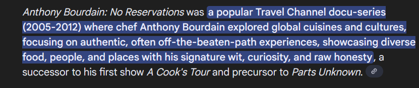 Anyways, I don't mind watching one episode of parts unknown, even if it is a food show. Which one one do you want me to watch?