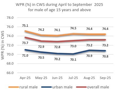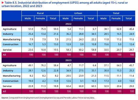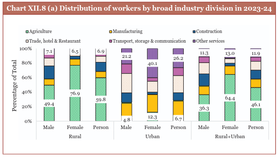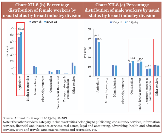 In urban areas, women predominantly work in other services, though this share declined slightly from 44.4 per cent in 2017-18 to 40.1 per cent in 2023-24. Significant employment of females is also observed in manufacturing, trade, and agriculture. Male workers in urban areas are seen to be primarily employed in manufacturing, construction, and trade-related services.