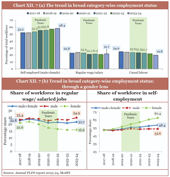 (male and female) in regular/salaried jobs decreased from 22.8 per cent to 21.7 per cent during the same period, the trend has stabilised since 2020-21, with employment levels either holding steady or showing gradual improvement.** The decline in casual workers, from 24.9 per cent to 19.8 per cent, also indicates a shift toward more structured forms of self-employment. These changes suggest an evolving workforce that embraces flexibility and independence in response to industry transformations and individual preferences.
