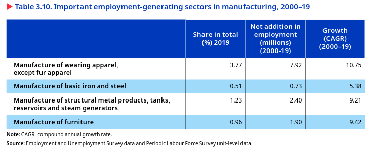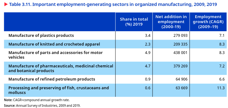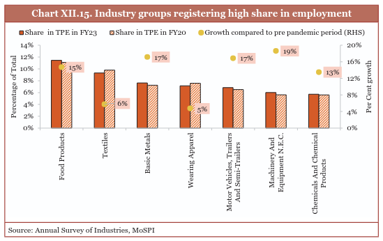 Seven industry groups in the sector contribute to around 54 per cent of the total employment. These are food products, textiles, basic metals, wearing apparel, motor vehicles, trailers and semi-trailers, machinery and equipment N.E.C., and chemicals and chemical products. Other than these leading industries, industry groups representing computer, electronic and optical products and the manufacture of furniture have seen strong growth in employment compared to the pre-pandemic level with around 50 per cent growth in TPE. This indicates a positive shift towards electronics manufacturing in India.