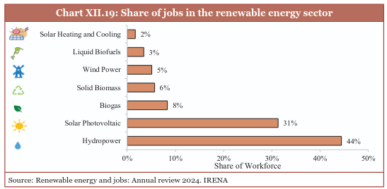 According to the 2024 Annual Review by the International Renewable Energy Agency (IRENA), the total number of jobs in the renewable energy sector in India reached an estimated 1.02 million in 2023. Hydropower is the largest employer in India’s renewable sector, providing approximately 453,000 jobs and accounting for 20 per cent of the global total, ranking second only to China.