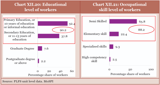 A detailed examination of the annual PLFS 2023-24 unit-level data has been conducted to understand India's skill and job landscape here. The PLFS data shows that 90.2 per cent of the workforce has equivalent to or less than a secondary level of education. This educational skill composition, as a result, leads to most of the workforce (88.2 per cent) being involved in low-competency occupations- elementary skilled and semi-skilled occupational skills.