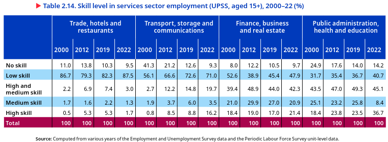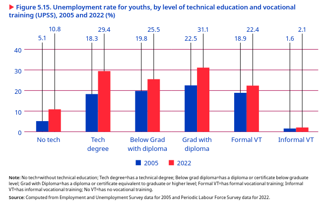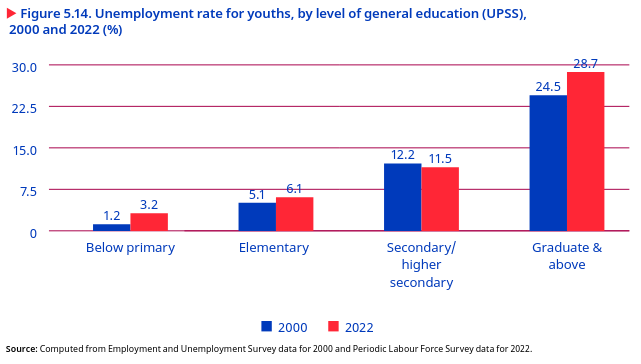 The unemployment rate increased among youths with a high level of education and was highest among youths with a graduate degree or higher in 2022. In 2022, the unemployment rate among youths with a graduate degree was significantly higher, at 28.7 per cent, than among youths with less than a primary education, at 3.2 per cent – almost nine times greater (figure 5.14). The share and number of unemployed graduate degree holders increased substantially between 2000 and 2022, while the share of unemployed youths with a low level of education declined. This indicates a problem of unemployment for highly educated youths, who accounted for nearly half of the total unemployed non-student youths in 2022.