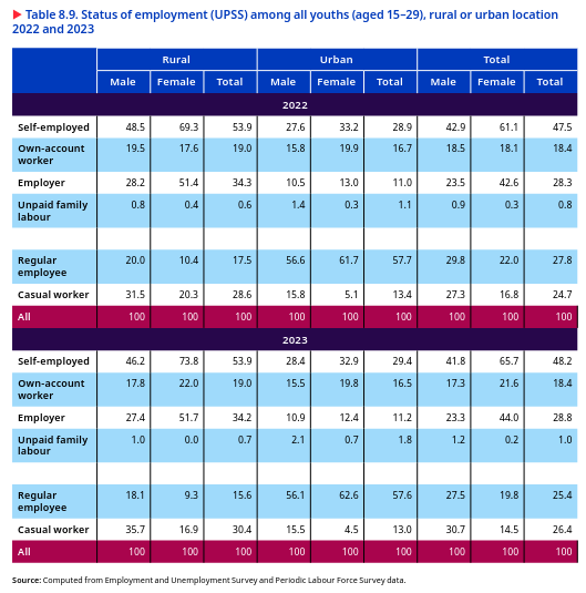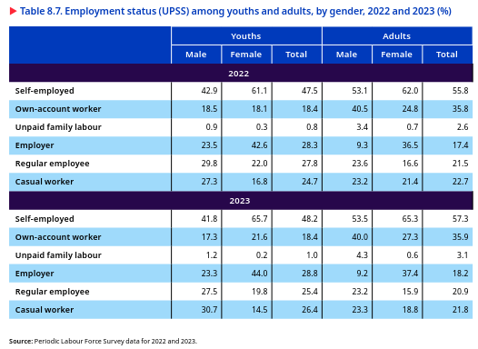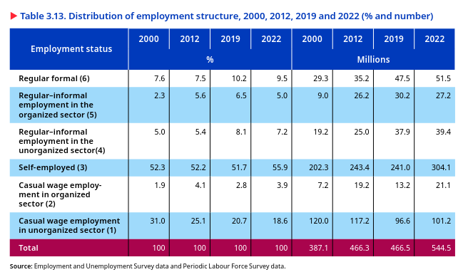 >The proportion of self-employed workers in the workforce has risen from 52.2 per cent in 2017-18 to 58.4 per cent in 2023-24. This shift reflects growing entrepreneurial activity and a preference for flexible work arrangements. **While the share of workers