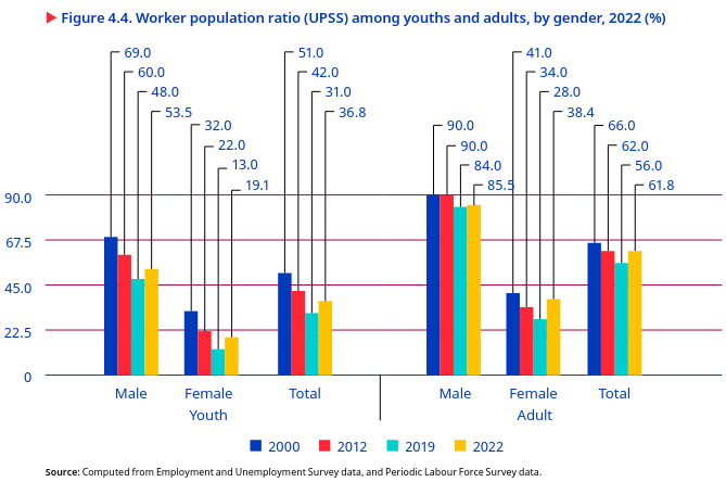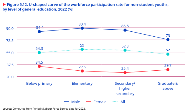 The relationship between levels of education and the worker population ratio among non-student male youths and all youths exhibits an inverted U-shaped curve, indicating that youths with low and high levels of education tend to participate less in the labour market. This finding is consistent with previous studies (UNESO 2019; World Bank 2018). In 2022, the worker population ratio for youths with an elementary or a secondary or higher-secondary level of education was 59 per cent and 57.8 per cent, respectively, indicating relatively greater participation rates (figure 5.12). Youths with less than a primary education and youths with a graduate degree had a lower worker population ratio, at 54.3 per cent and 52 per cent, respectively (figure 5.11. Interestingly, when analysing the worker population ratio by education level among young women, a slightly U-shaped curve emerged, reflecting a different pattern than that of the men and aligning with the findings from several previous studies (see for example, ILO 2020a).