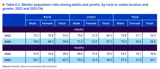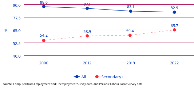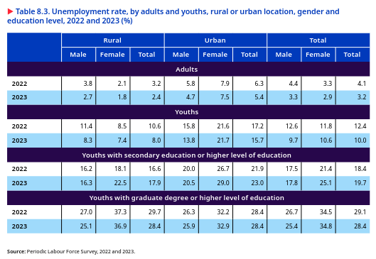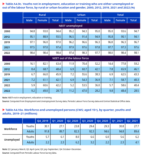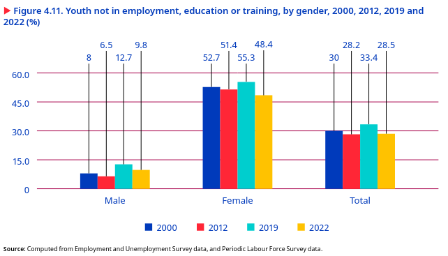 The youth unemployment rate increased with the level of education, with the highest among graduates and higher among women than men. The educated unemployment rate increased over the past 22 years, but with a sharp decline between 2019 and 2022. In 2022, the unemployment rate among youths was six times greater for those who had completed secondary education or higher (18.4 per cent) and nine times higher for graduates 27 (29.1 per cent) than for persons who could not read or write (3.4 per cent). This was relatively higher among educated young women (21.4 per cent) than men (17.5 per cent), especially among female graduates (34.5 per cent), compared to men (26.4 per cent) with similar qualifications.