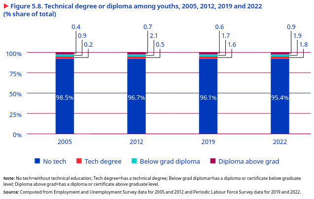 Despite the increase in the proportion of youths with technical education over time, the level of technical qualification among young people remains relatively low in India. In 2005, 33 2.8 per cent of youths had earned a technical degree, diploma or certificate (0.3 per cent for a degree, 1.7 per cent for a graduate-level (below or above) diploma and 0.8 per cent for a certificate). By 2022, that proportion of youths with a technical qualification had nearly doubled, to 4.6 per cent (1.9 per cent with a technical degree, 0.8 per cent with a diploma and 1.9 per cent with a certificate) (figure 5.8).