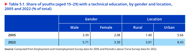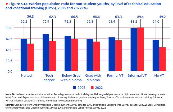 The share of technically qualified individuals among non-student youths expanded over time, although it remained relatively low. However, the worker population ratio among youths with technical degrees experienced a more substantial decline than youths with a technical training diploma. In 2022, the worker population ratio among youths with a technical degree (62.3 per cent) or a below-graduate-level diploma (66.5 per cent) was relatively higher than youths without any technical qualification (56.3 per cent) or graduates with a diploma (60.6 per cent) (figure 5.13). However, the worker population ratio among youths with a technical degree and those without any technical qualification declined more sharply than among diploma holders between 2005 and 2022 (ILO 2022a). These findings suggest two important factors: First, there has been an increase in the supply of youths with technical degrees, indicating expansion in technical education (ILO 2022a). However, the declining worker population ratio among technical degree holders suggests challenges, such as a lack of suitable job opportunities or a mismatch between their skills and the demands of the labour market (ILO 2022).
