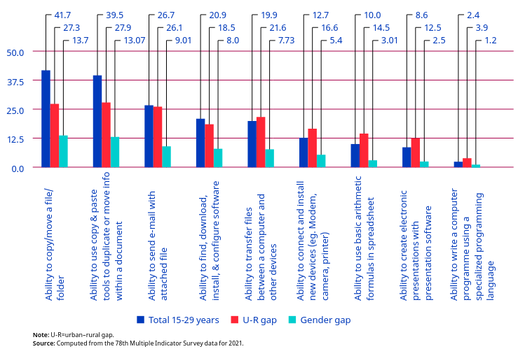 The rural–urban disadvantage far outstripped the disadvantage for women in relation to men in terms of ICT skills. For instance, 61 per cent of urban youths had capability of copying or moving a file and folder while only 34 per cent of rural youths had similar skill. And one fourth of urban youths could connect and install new devices (camera, modem, printer, etc.), while only 8 per cent of rural youths could do so.