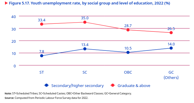 The unemployment rate among highly educated youths from a marginalized Scheduled (indian) or Scheduled Tribe group was higher when compared with similar youths from Other Backward Class or General Category. Among youths who had completed secondary or higher-secondary education in 2022, the unemployment rate for those from a Scheduled (indian) (13.4 per cent) was higher than for those from an Other Backward Class (10.5 per cent) and almost equal to those from a General Category (indian) (14 per cent) (figure 5.17). Among youths with a graduate degree or higher, the unemployment rate for those from a Scheduled (indian) (35 per cent) or Scheduled Tribe (33.4 per cent) was higher when compared with youths from an Other Backward Class (28.7 per cent) or a General Category (indian) (26.5 per cent).