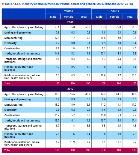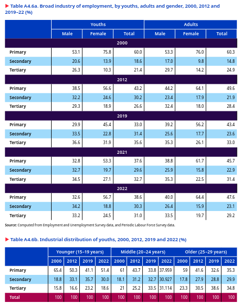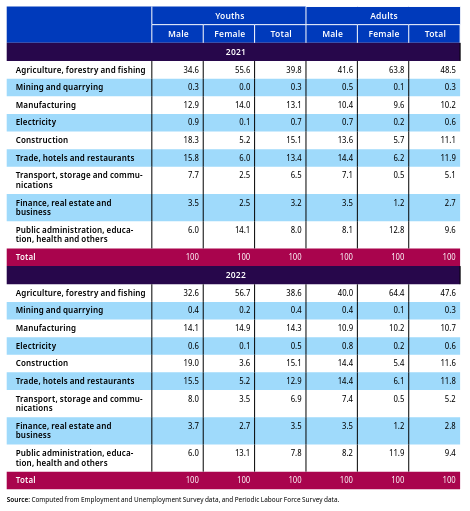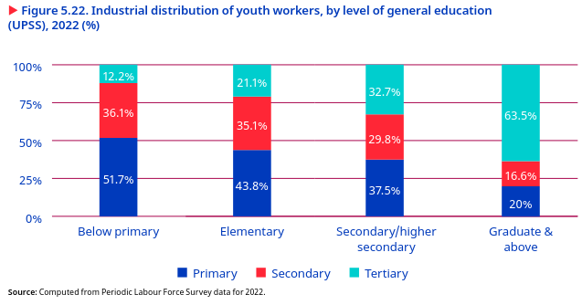 In 2022, 63.5 per cent of youths with a graduate or higher education were engaged in the tertiary sector. This reflects the preference for white-collar jobs and the demand for skilled professionals in services-based industries. In contrast, the involvement of highly educated youths in primary and secondary sectors was relatively low, with 12.2 per cent of youths having less than a primary education and 32.7 per cent at the secondary level (figure 5.22)