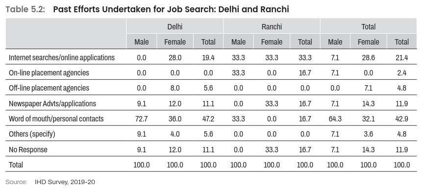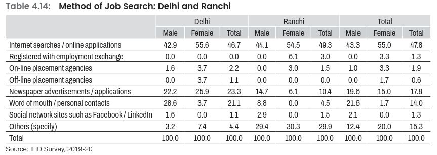 Almost half of the youth respondents reported searching job through internet or other online applications(47.8%) followed by newspaper advertisement/applications (17.8%), word of mouth/personal contacts (14%), with few from social networking sites, registration with employment exchange, and on-line placement agencies (Table 4.14) The method of internet search or use of online applications was more popular among females compared to males, which across cities these search methods were more prevalent among youth in Delhi than in Ranchi. Newspaper advertisements and word of mouth or personal contacts was also more popular search method in Delhi’s youth compared to Ranchi, which is obvious due to higher penetration of these job search modes in the former than latter.