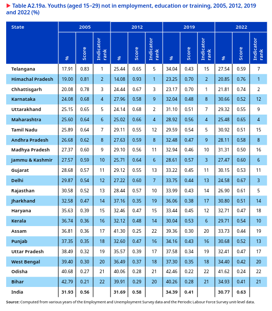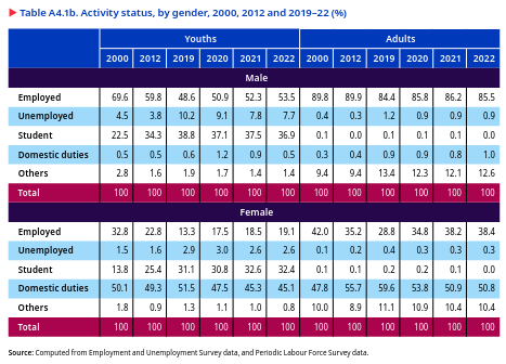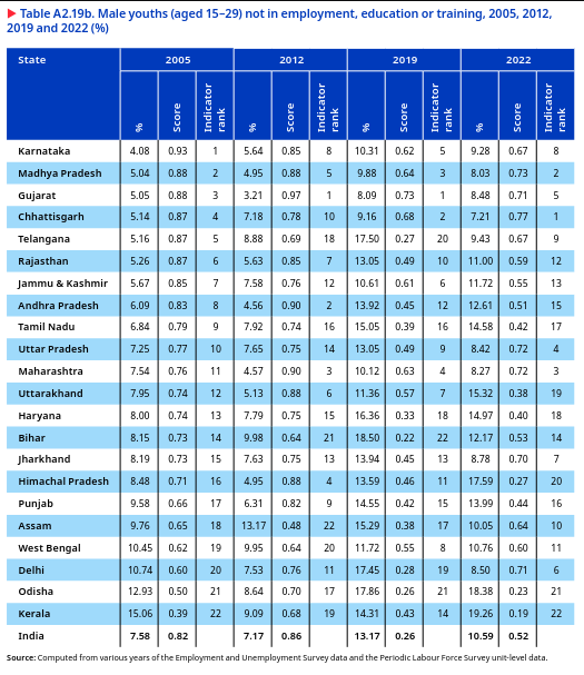 One in three young people was not in employment, education or training in India, which was almost equal in rural and urban areas and increased over the years. In 2022, the proportion of youths with such status remained high, at 28.5 per cent, with almost equal proportions in rural (28.7 per cent) and urban areas (29.7 per cent). This proportion of youths increased from 29.9 per cent in 2000 to 33.4 per cent in 2019 but decreased to 28.5 per cent in 2022. This indicates that many young people missed out on a crucial early stage of their personal development and risk facing severe disadvantages in the labour market in the future (ILO 2022a).