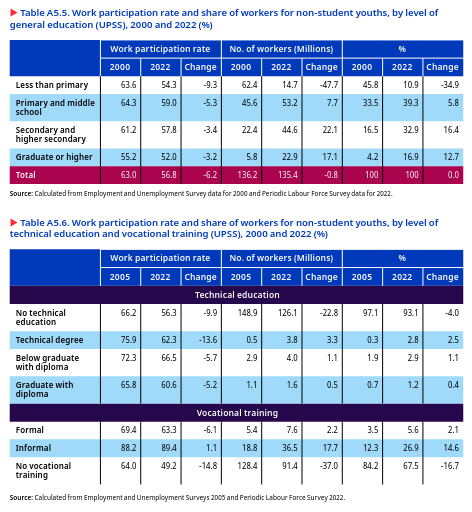 The proportion of young people with a secondary or higher levels of education more than doubled in the past two decades, from 27.9 per cent in 2000 to 58.3 per cent in 2022 (figure 5.1). The percentage of young individuals with a graduate-level of education or higher also experienced great growth, rising from 5 per cent to 14.7 per cent between 2000 and 2022. But the share of youths who are not literate plummeted, from 29.5 per cent in 2000 to 5.4 per cent in 2022, and those with only a primary level of education also declined, from 20.7 per cent to 10.7 per cent. Although this progress is remarkable, at least in quantitative terms, still, 41.8 per cent of young individuals in 2022 had only completed elementary education or had no formal education at all.