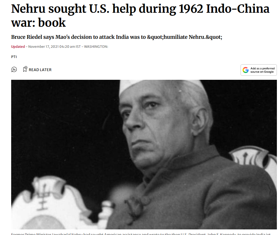 >Nehru sought U.S. help during 1962 Indo-China war: book