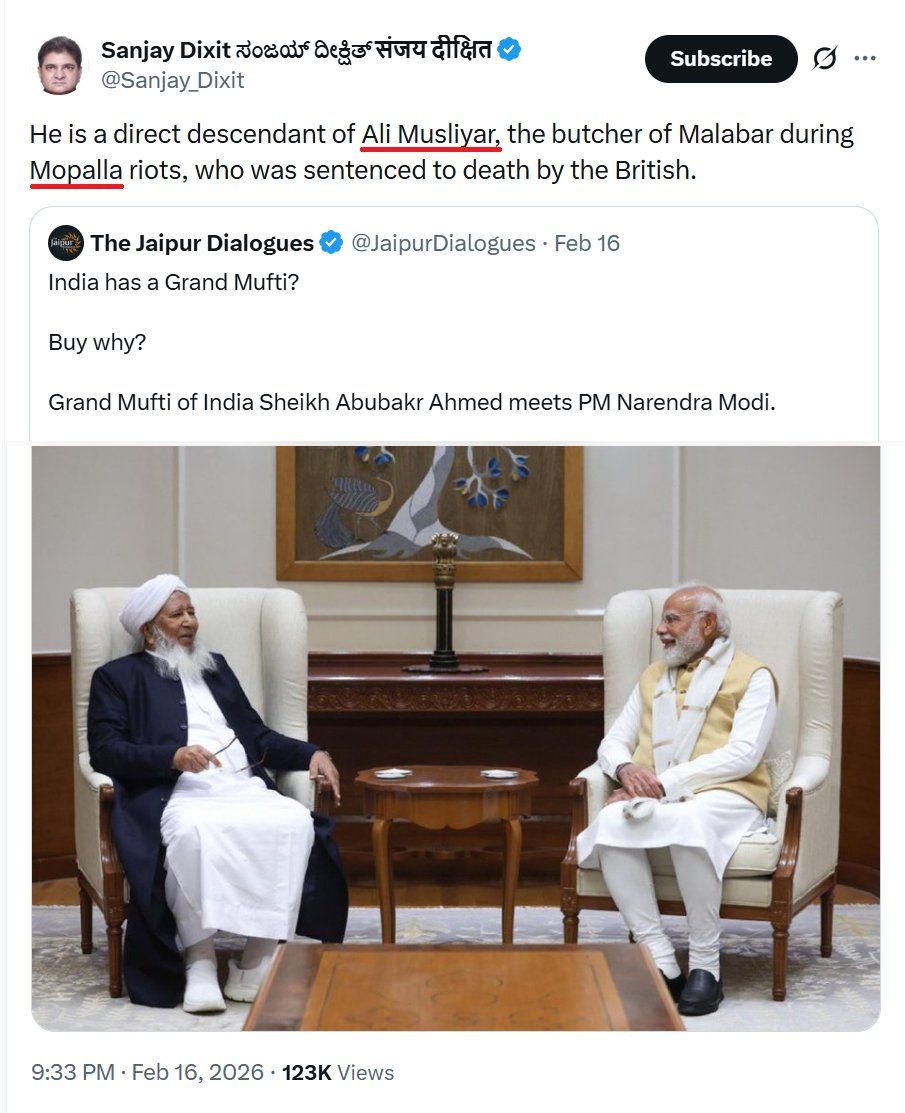 Just a small correction. He is not a descendent. Musliyar is a Honorific title. This lies is spread by a dick shit.