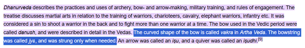 >The curved shape of the bow is called vakra in Artha Veda. The bowstring was called jya, and was strung only when needed.