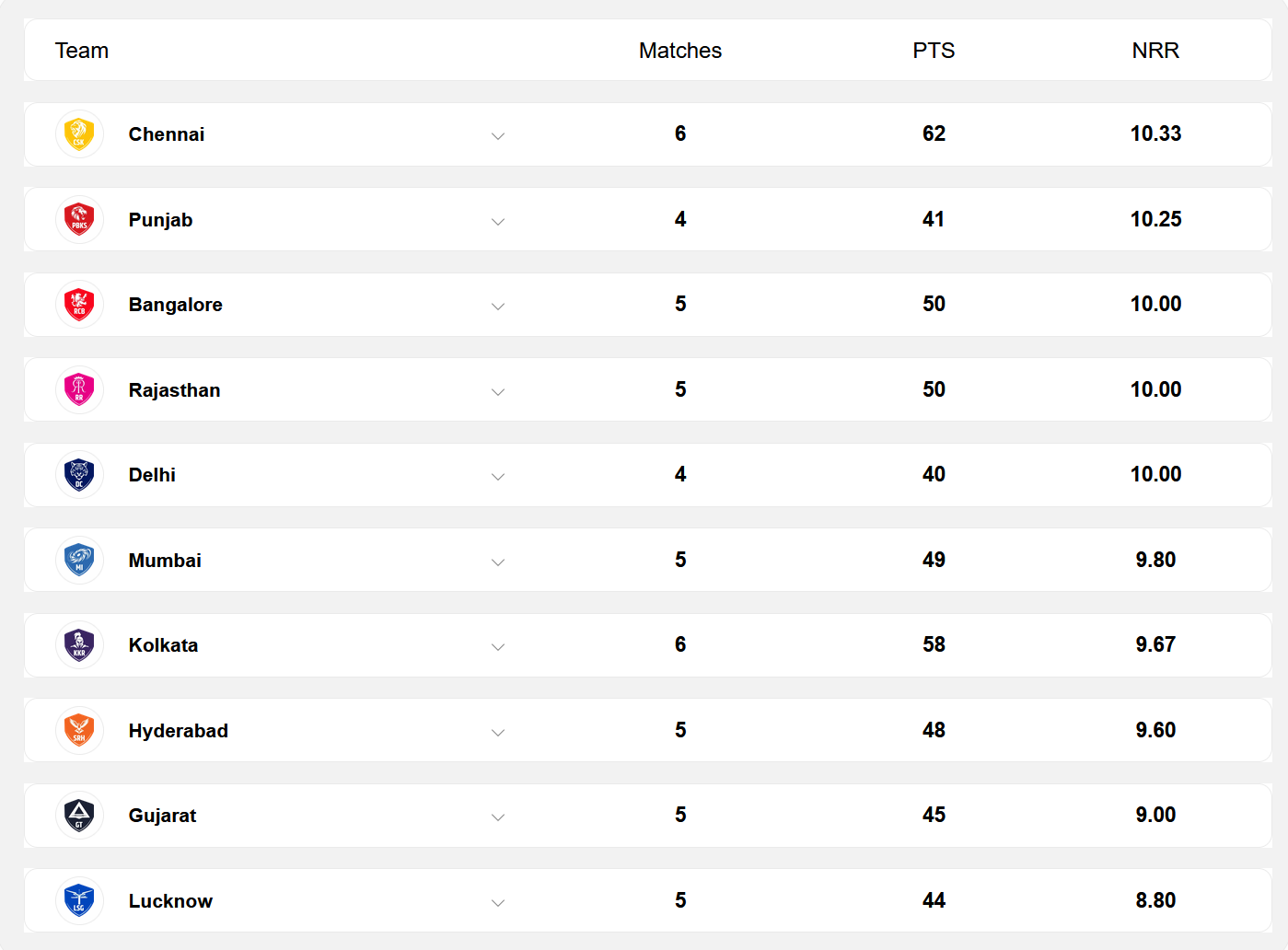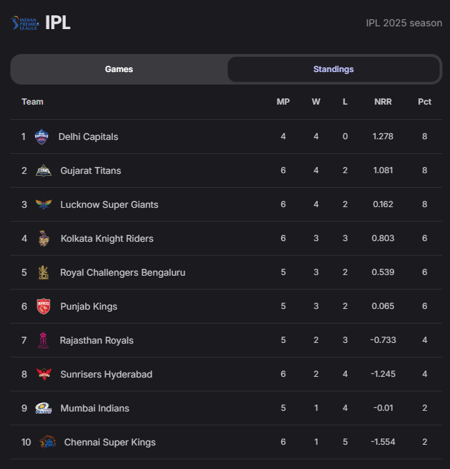 Points table: https://www.iplt20.com/points-table/men